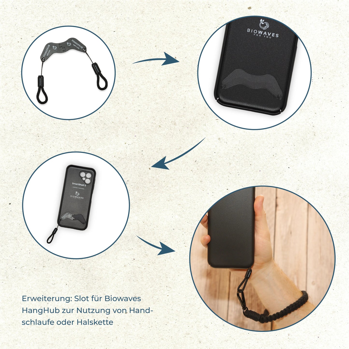 L'ensemble comprend le SmartShell 5 biodégradable, le HangHub sans outil et un bracelet en macramé fait main à partir de coton biologique recyclé.