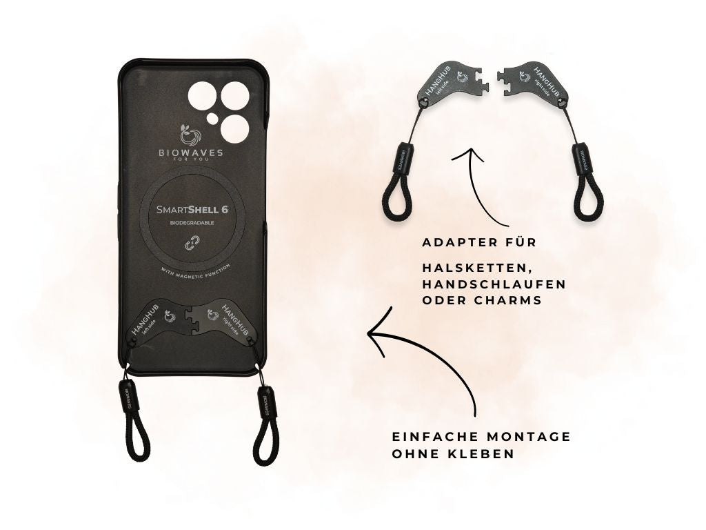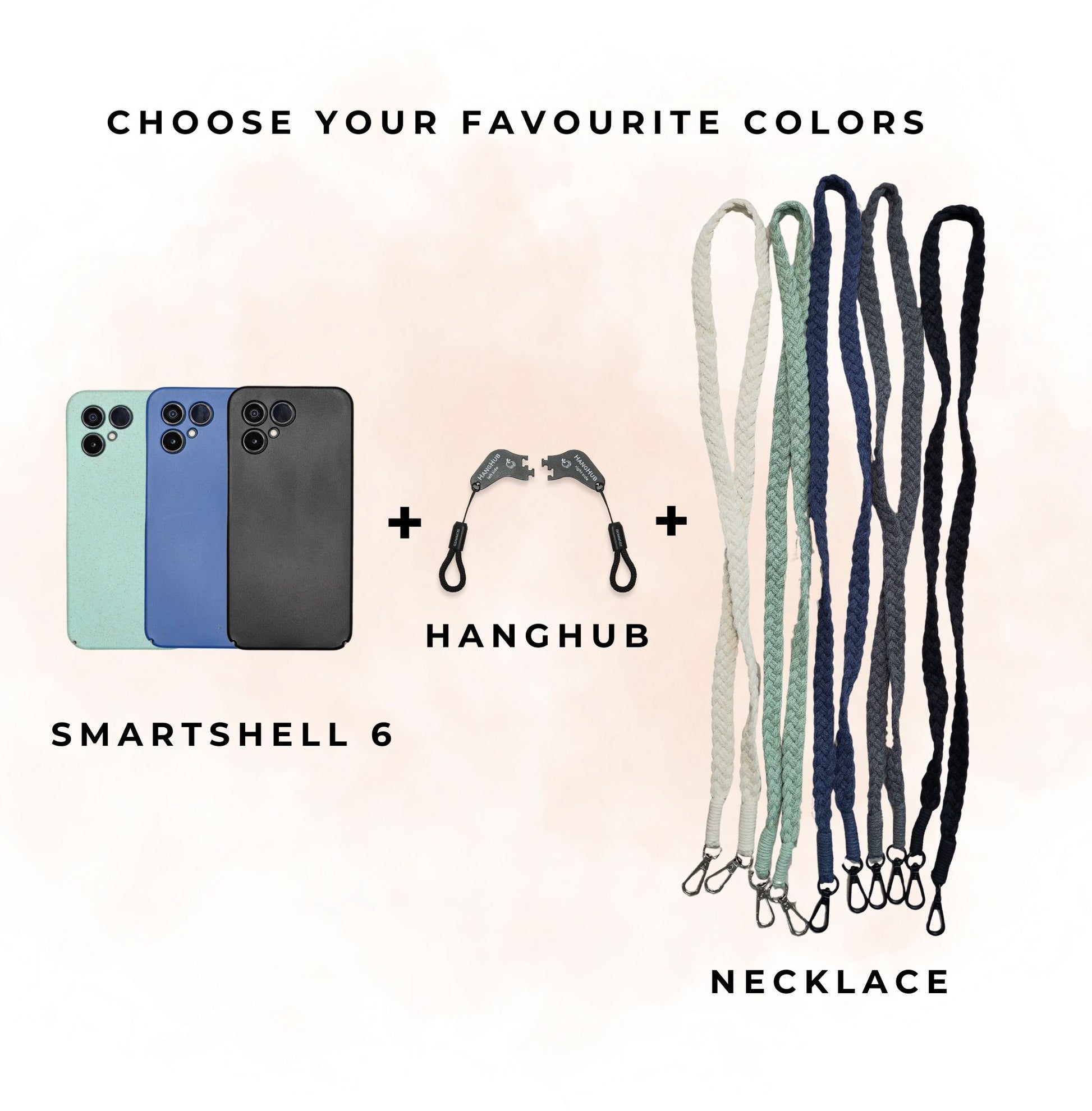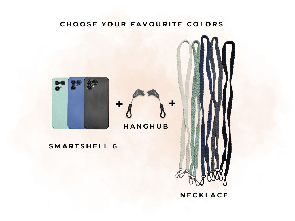 Im Set enthalten sind die biologisch abbaubare SmartShell 6 der werkzeuglos einsetzbare HangHub sowie eine handgefertigte Makramée-Halskette aus recycelter Bio-Baumwolle.