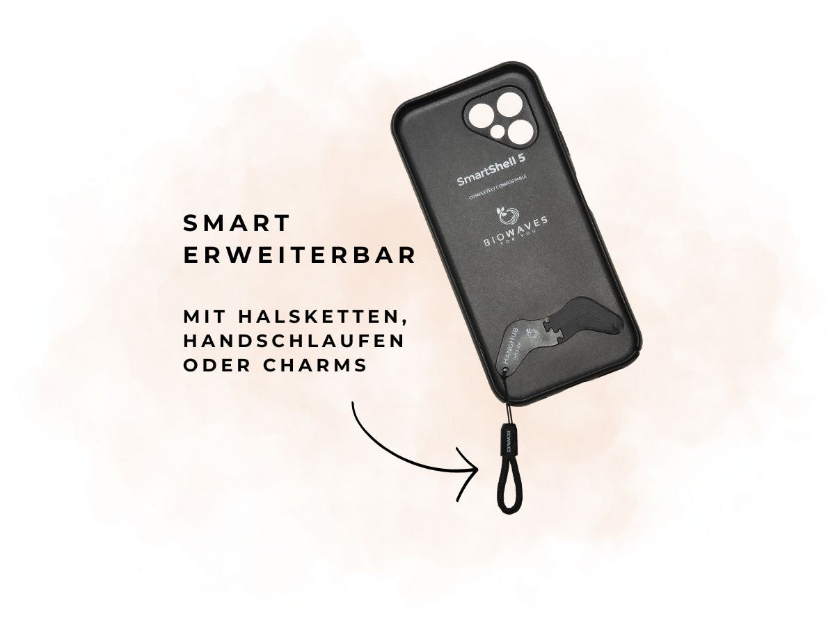 Ja! Der HangHub ist als separates Zubehör in unserem Shop erhältlich und lässt sich mit wenigen Handgriffen in den Einlegeslot der SmartShell 5 einsetzen. So kannst du deine Hülle flexibel erweitern – etwa mit einer Handschlaufe oder Tragekette für noch mehr Komfort und Sicherheit unterwegs.